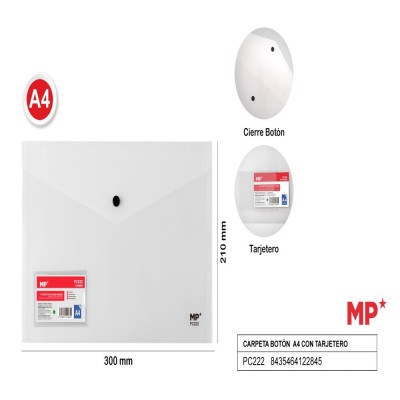 Carpeta A4 con tarjetero y cierre de botón. Transparente.