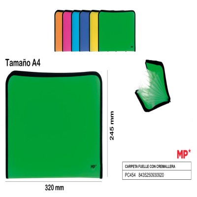 Carpeta estilo fuelle con cremallera de color verde. Diferentes colores disponibles.