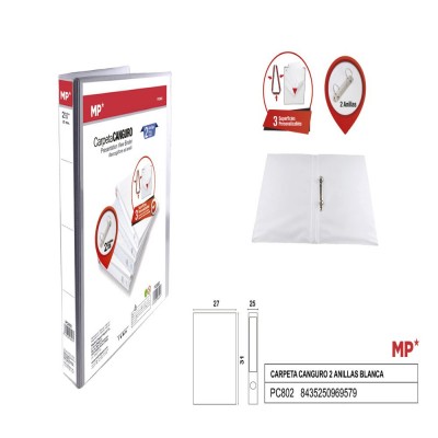 Carpeta de color blanco, estilo canguro con 2 anillas y 3 superficies personalizables.
