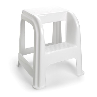 Taburete domus de color blanco. No usar sobre superficies inclinadas, mojadas o deslizantes. Si es necessario se puede anclar el producto a una superficie.