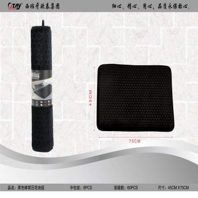 Alfombra de baño, de color negro con relieves en forma de hexágono.