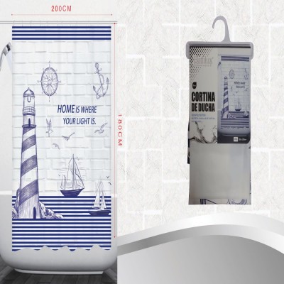 Cortina de ducha estilo marinero con frase "Home is where your light is".