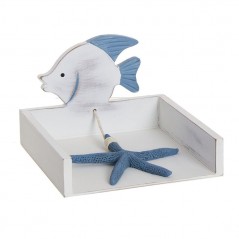 Servilletero blanco de madera con detalle en forma de estrella marina que sirve para sujetar las servilletas. Incluye detalle en la base en forma de pez o barco.