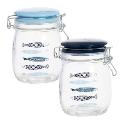 Bote de cristal con tapa de cerámica de color azul marino. En la parte delantera incluye múltiples dibujos de peces de diferentes tonalidades de azul. Diferentes modelos disponibles.