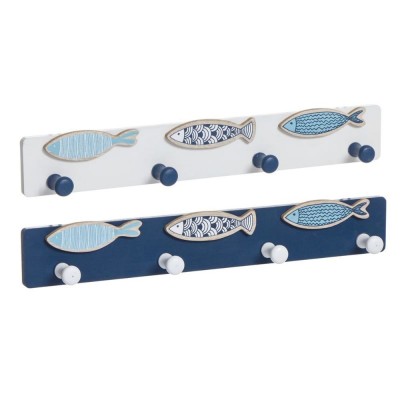 Percehero de color azul.formado por 4 colgadores blanco. Contiene detalles en la parte superior en forma de peces de múltiples colores.