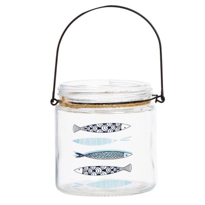 Jarrón transparente con dibujo de múltiples peces de tonalidades azules y asa metálica negra. Ideal para colocar velas. Diferentes modelos disponibles.