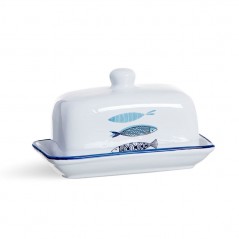 Mantequillera blanca con detalle de peces azules en la parte delantera. Colección disponible.