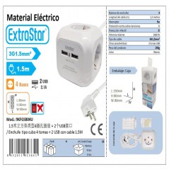 Alargador con enchufe tipo cubo con 4 tomas más 2 USB con cable 1.5M.