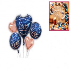 Globo de foil de color azul con detalles en rosa metálizado. Incluye cuatro figuras: un corazón de color azul con detalles de corazones y el mensaje de "Love", dos corazones de inferior tamaño de color rosa metálizado y dos círculos con mensajes de "Love" y "Better Together".