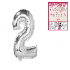 Globo de foil en forma de número 2 de color plateado. Resistente y reutilizable, apto para aire, adhesivos y auto cierre incluidos. Diferentes medidas disponibles.