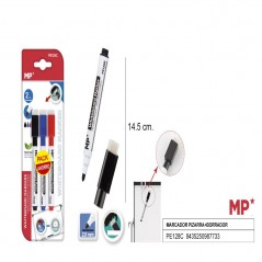 Set de 3 marcadores para pizarra, incluye un borrador. 3 colores incluidos en el set: rojo, azul y negro.
