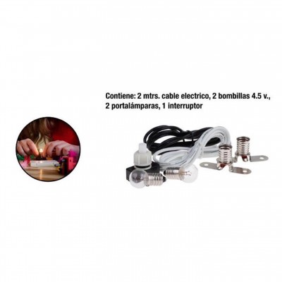 caracteristicas: kit elÉctrico que contiene 2m de cable elÉctrico, 2 bombillas de 4,5V., 2 portalámparas y 1 interruptor
