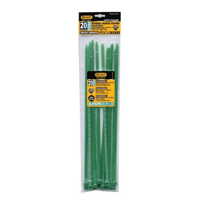 Codigo de barras: 8433392166627 Color: Verde Material: Nailon 7.2x350cm Descripcion: Bridas de nailon, contiene 20 piezas por paquete dimensiones de apertura min. 2.8mm max. 58mm