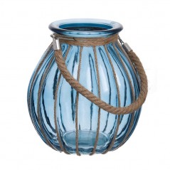 Jarrón circular de color azul de tamaño mediano con asa formada por cuerda  marrón, estilo rústico. Jarrón decorado linealmente con cuerdas.