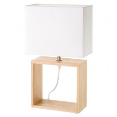 Lámpara con base de forma rectangular de madera y pantalla blanca. Estilo natural, diferentes modelos disponibles. Cable blanco con interruptor incluido. No incluye bombilla.