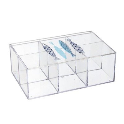 Caja de té transparente con dibujo de peces azules en la tapa. Caja formada po 6 divisiones. Colección disponible.