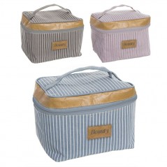 Neceser rosa con líneas blancas, detalles marrones y etiqueta con la palabra Beauty en la parte delantera central. Diferentes medidas disponibles.