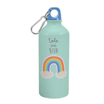Cantimplora de aluminio azul turquesa con dibujo de arcoíris y texto que pone "Todo irá bien". Diferentes modelos disponibles.