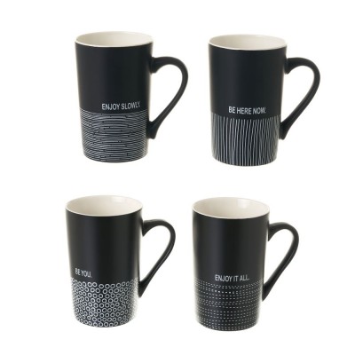 Taza negra mate con detalle de línea horizontales blancas y texto "Enjoy slowly". Cuatro modelos y dos colores disponibles.
