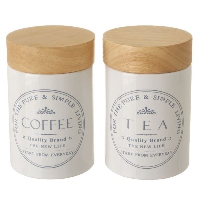 Tarro para el café de color blanco con detalles de madera. Incluye detalle circular en la parte delantera con texto: "For the pure & simple living".Coffee. Quality brand. New life. Start from everyday". Colección disponible.