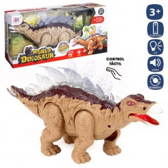 Figura de dinosaurio estegosaurio, puede andar, tiene sonido y luz. Funciona con un control de movimiento táctil.