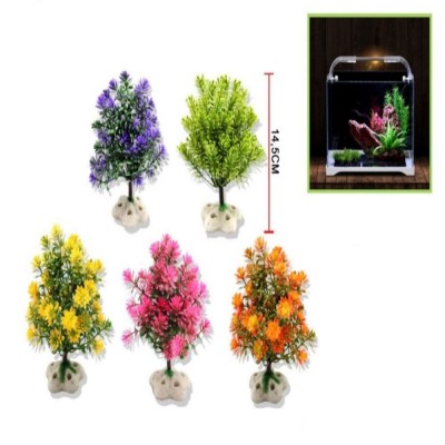 Adorno de acuario en forma de árbol de color morado con detalle de hojas y base de piedra. Diferentes colores disponibles.