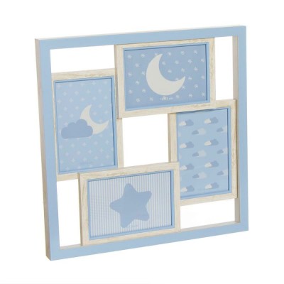 Portafotos múltiple formado por cuatro marcos de color azul con borde de madera. Diferentes modelos disponibles.