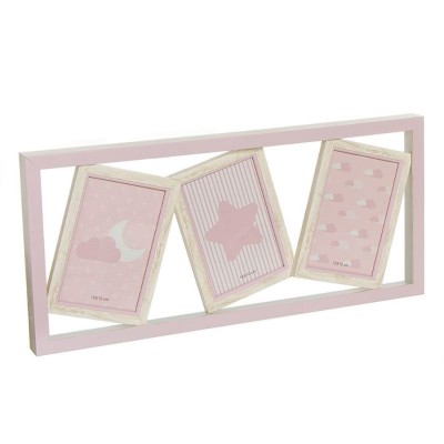 Portafotos múltiple formado por tres marcos de color rosa con borde de madera y borde rectangular. Diferentes modelos disponibles.