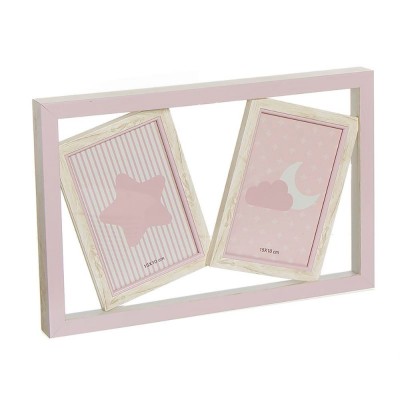 Portafotos múltiple formado por dos marcos de color rosa con borde de madera y borde rectangular. Diferentes modelos disponibles.