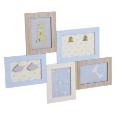 Portafotos múltiple formado por cinco marcos de color azul de múltiples tamaños y estilos. Incluye dos pinzas en forma de nube y dos pinzas doradas. Diferentes modelos disponibles.