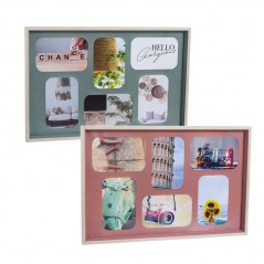 Portafotos que puede incluir hasta seis fotos. Portafotos rosa con borde de madera. Dos modelos disponibles.