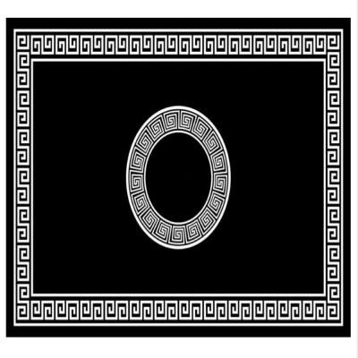 Alfombra de color negro con detalles de color blanco alrededor de toda la alfombra y detalle circular en la parte central.