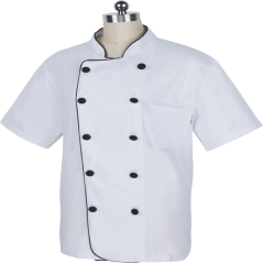 Chaqueta americana de cocina de color blanco con detalles en negro y doble botones.