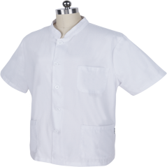 Bata de color blanco unisex con un bolsillo en la parte delantera y botones a lo largo de la bata. Prenda de cuidado fácil y cuello cerrado.
