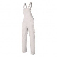 Pantalón con peto con hebillas de plástico, botones laterales y bolsillo de gran tamaño en la parte superior. Color blanco. Diferentes modelos disponibles.