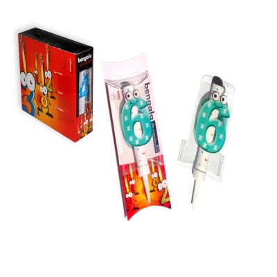 Bengala de cumpleaños decorada y con detalle de ojos, número 6.