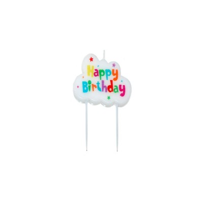 Vela en forma de nube con estampado de Feliz Cumpleaños en colores.