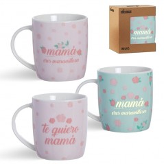 Pink mug with rose print, includes text on the central front that says "Mom, you are wonderful" and on the back that says "Because there is nothing better than having you mom" in blue. Two colors available: pink and pastel blue.