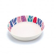 Deep plate with leaf patterns as a border in pink, purple and blue. BPA Free, Not Microwave Safe, Dishwasher Safe. Collection available.