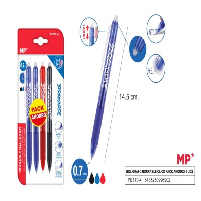 Set of 4 erasable pens, savings pack, 3 colors (blue, red and black).