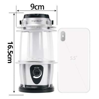 Silver light camping light with hook and rotary dimming.