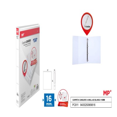 White binder, kangaroo style with 4 rings and 3 customizable surfaces.