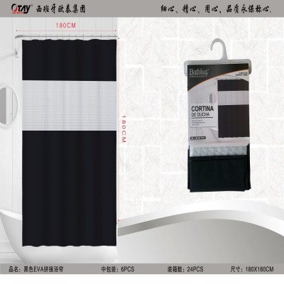 Black shower curtain with transparent details.