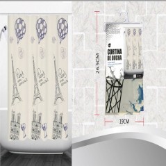 Shower curtain with a pattern of drawings of the city of Paris accompanied by the phrase "Paris mon amour".