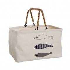 White patch style basket with three blue fish embroidery on the front. Contains two wicker handles.