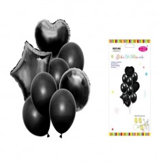 Pack of 10 black polyamide balloons. It includes shapes like two hearts and a star. Resistant and reusable, suitable for air and adhesives and self-closing included.