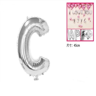Foil balloon in the shape of the letter C of silver color. Resistant and reusable, suitable for air, stickers and self-closing included.