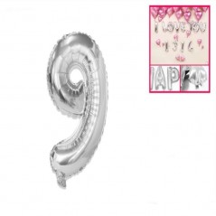 Foil balloon in the shape of a number 9 in silver color. Resistant and reusable, suitable for air, stickers and self-closing included. Different sizes available.