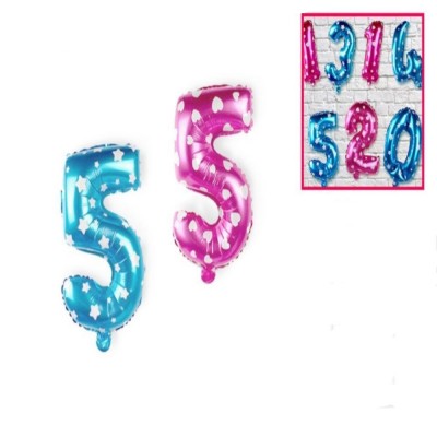 Foil balloon in the shape of the number 5 in pink with a pattern of hearts or blue with a pattern of stars. Resistant and reusable, suitable for air, stickers and self-closing included.
