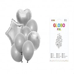 Pack of 10 gray polyamide balloons. It includes shapes like two hearts and a star. Resistant and reusable, suitable for air, adhesives and self-closing included.
